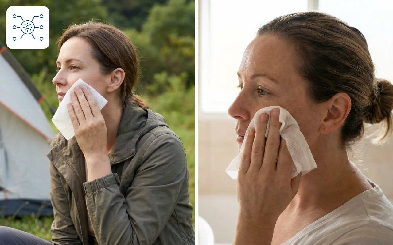 Perfekt zum Waschen, für Reisen, Sport und Beauty. Reinigen Sie Oberflächen, Gesichter und Hände überall und jederzeit im Handumdrehen.