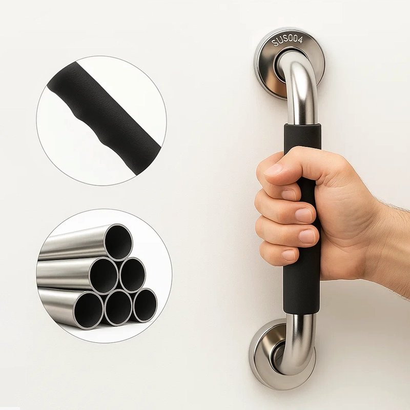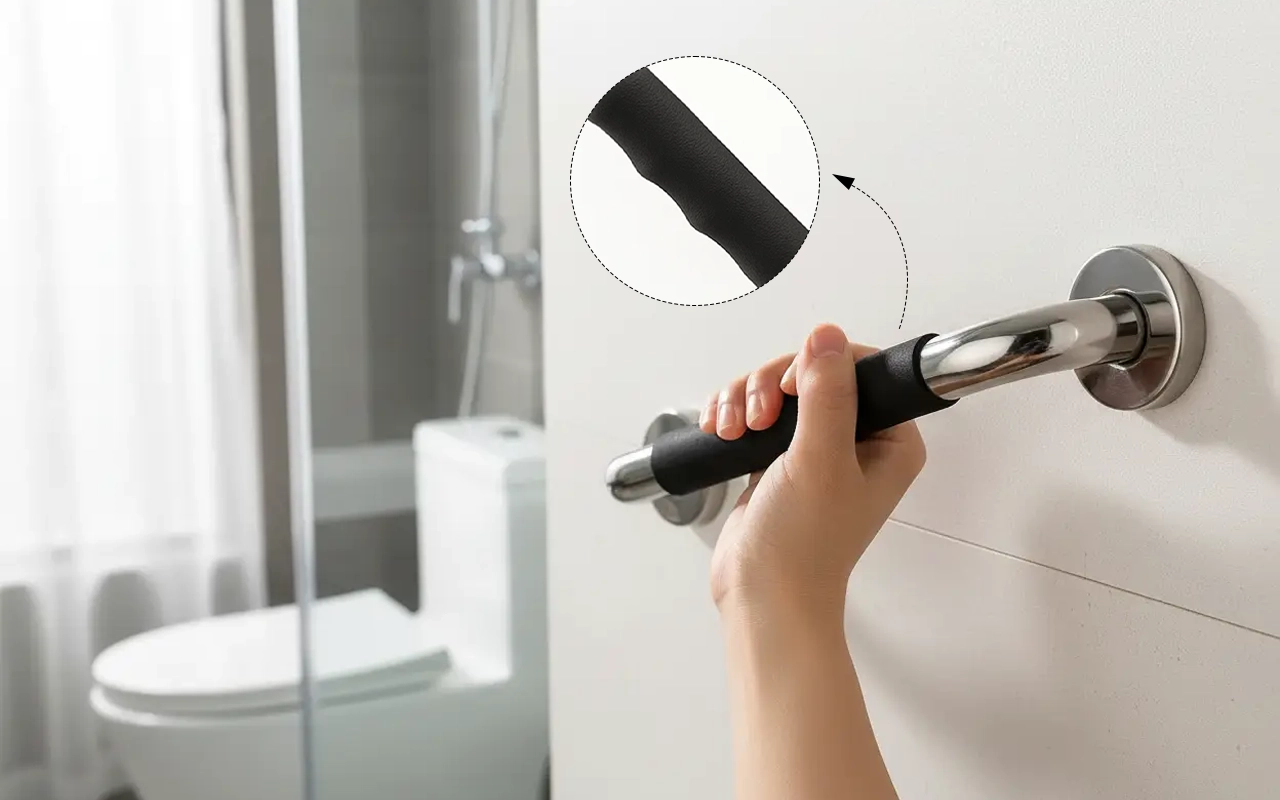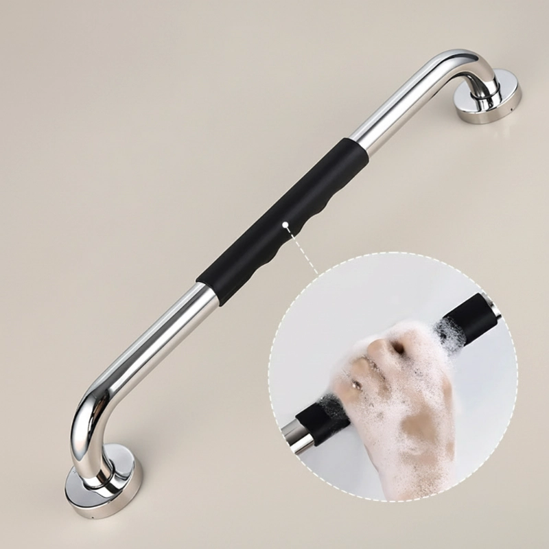 Der Silikonteil dieser Stange verhindert, dass meine Hände abrutschen. Außerdem sieht sie im Bad überhaupt nicht fehl am Platz aus.