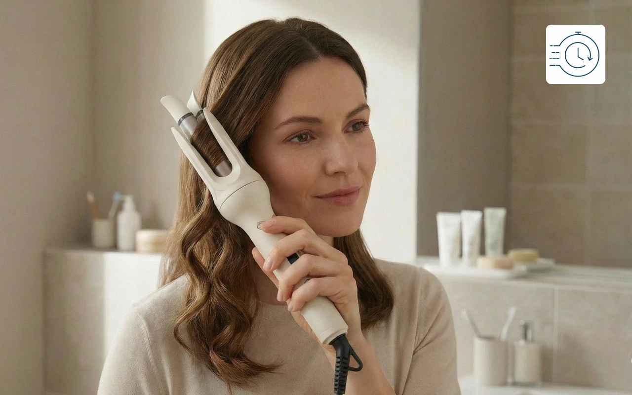 Mit diesem Lockenstab ist das Fertigmachen so viel einfacher. Ich style meine Haare in weniger als fünf Minuten, und sie sehen den ganzen Tag schwungvoll und weich aus.