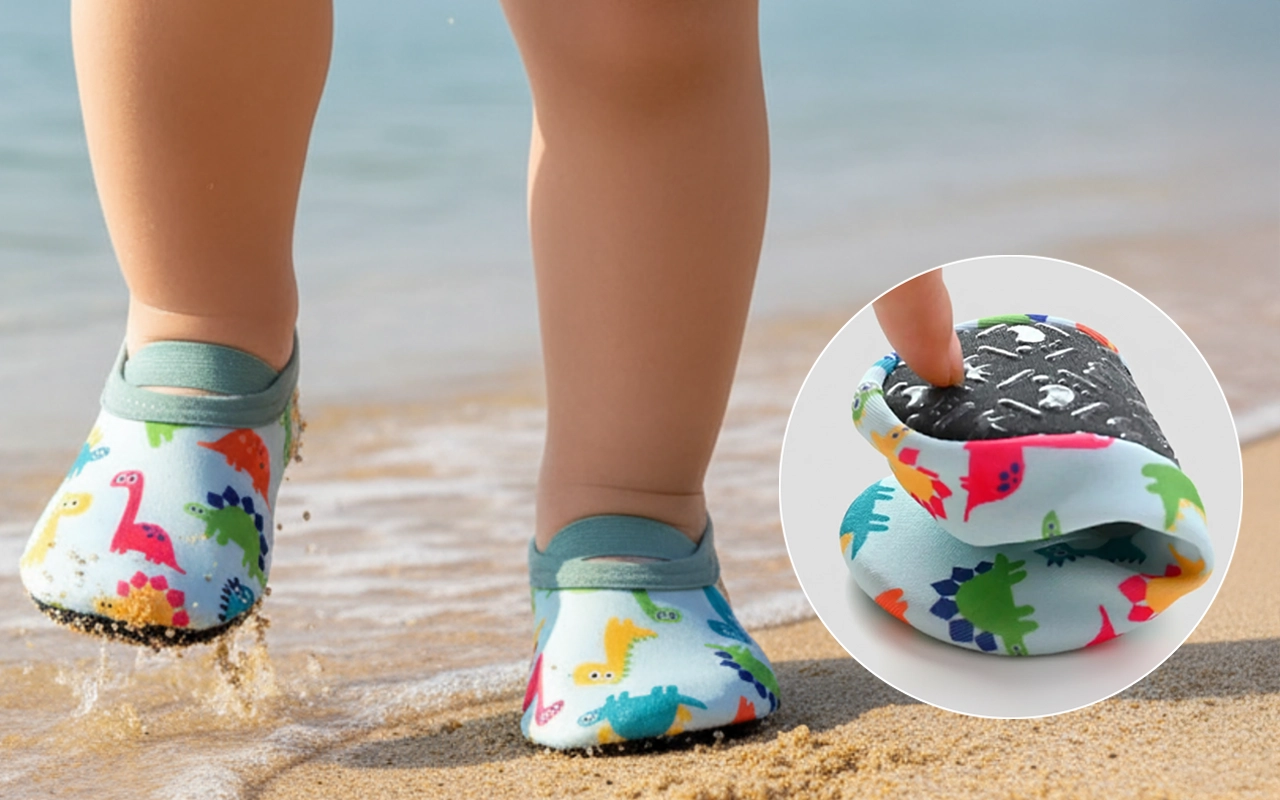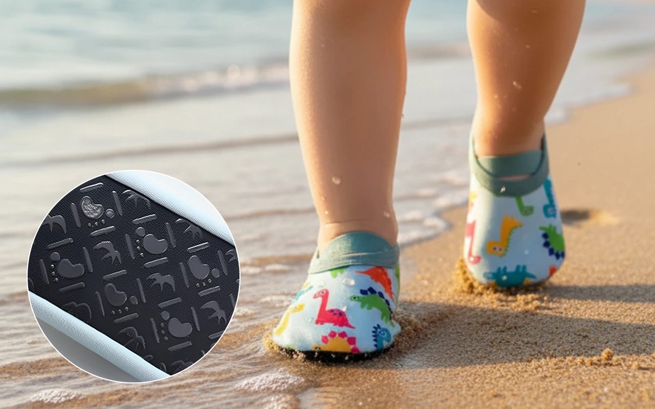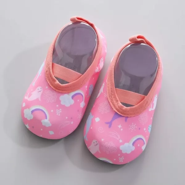 Unsere Schuhe haften fest auf nassen Oberflächen und helfen Kindern, sicher auf den Beinen zu bleiben.