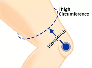 - 2. Legen Sie das Maßband um die breiteste Stelle Ihres Oberschenkels, etwa 10 cm/4" über der Mitte Ihrer Kniescheibe.