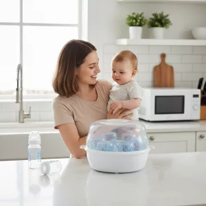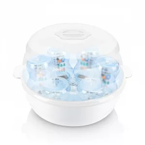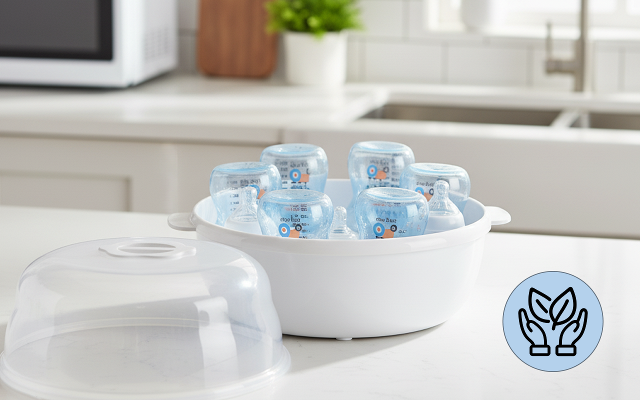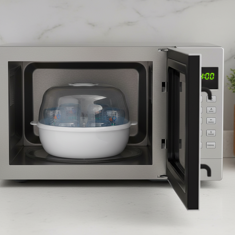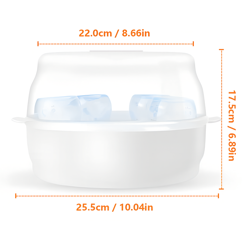 Passt problemlos in meine Mikrowelle und ist viel schneller als Wasser kochen. Ich vertraue darauf, dass keine Keime an den Flaschen meines Babys bleiben.