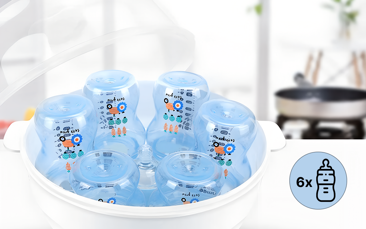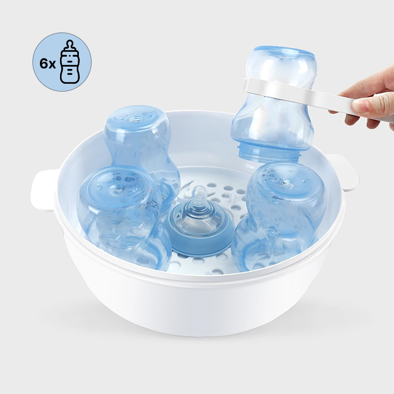Sechs Flaschen passen zusammen in einen einfachen Dampfzyklus. Ideal für geschäftige Tage oder Familien mit mehr als einem Kind.