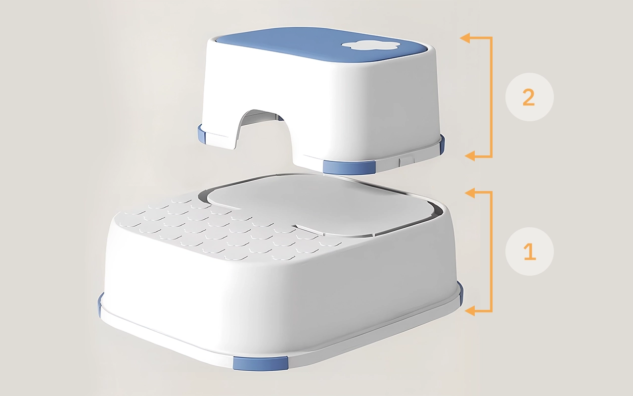 Zwei Stufen ermöglichen es den Kleinen, höhere Flächen leicht zu erreichen. Aufgaben wie Händewaschen oder Zähneputzen werden mühelos.