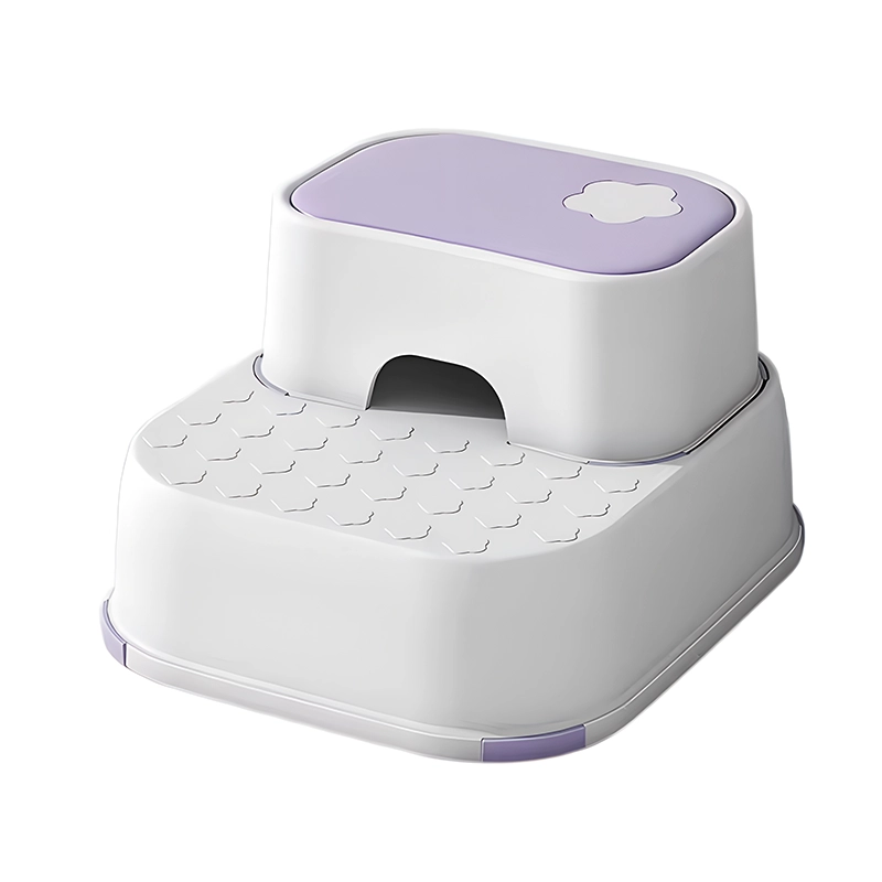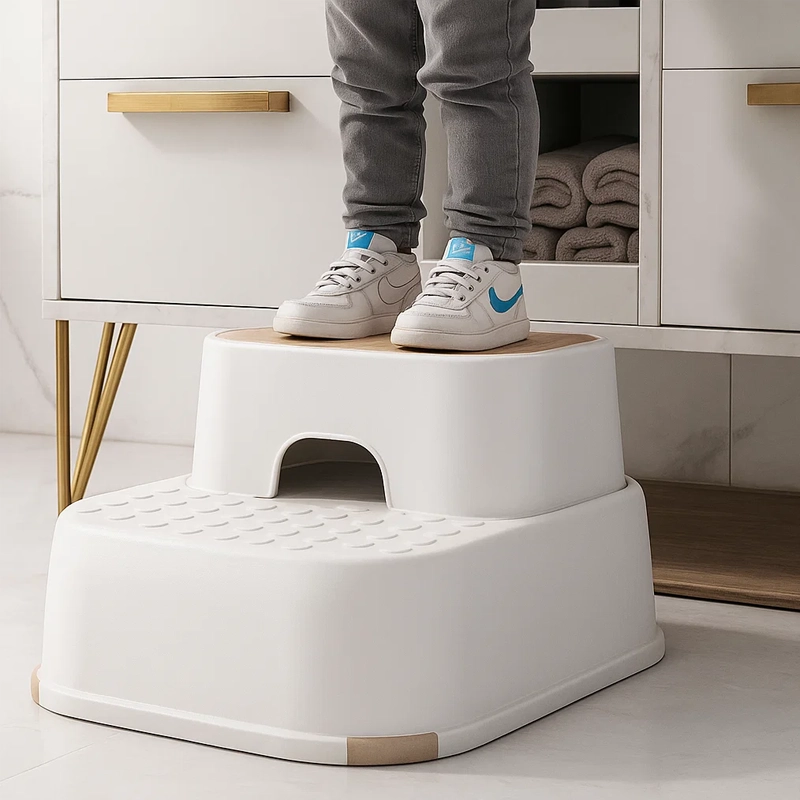 Zwei Stufen ermöglichen es den Kleinen, höhere Flächen leicht zu erreichen. Aufgaben wie Händewaschen oder Zähneputzen werden mühelos.