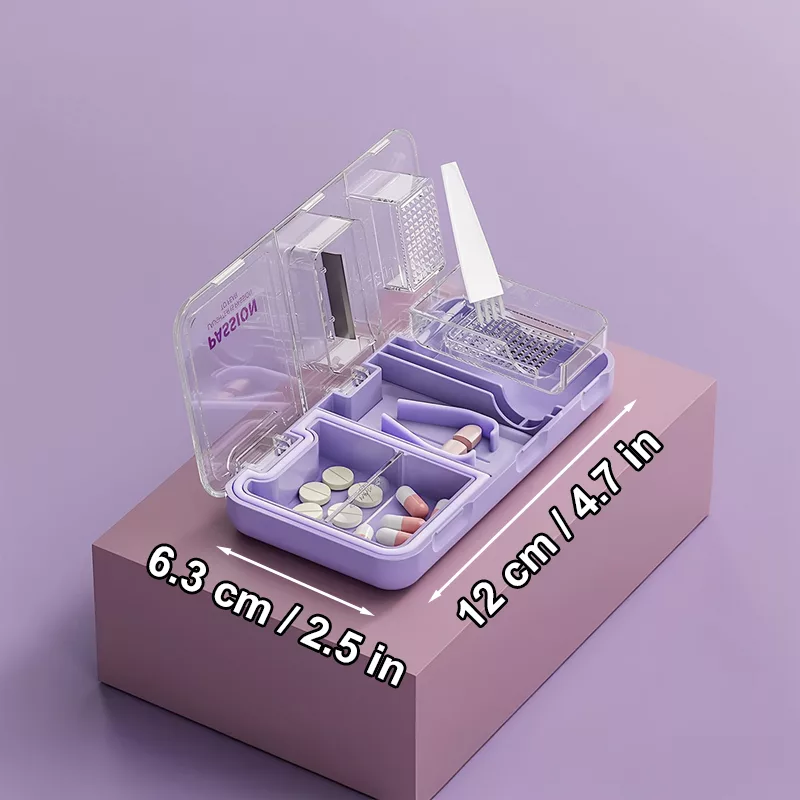 Da ich viel reise, muss ich meine Tabletten immer dabei haben. Diese Box fasst viel, öffnet sich nicht von selbst, und der Schneider funktioniert für alle Größen.