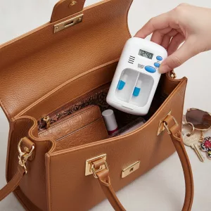 Das leichte Gehäuse passt problemlos in jede Tasche oder Hosentasche. Nehmen Sie Ihre Gesundheitsroutine überallhin mit – selbstbewusst und gut vorbereitet.
