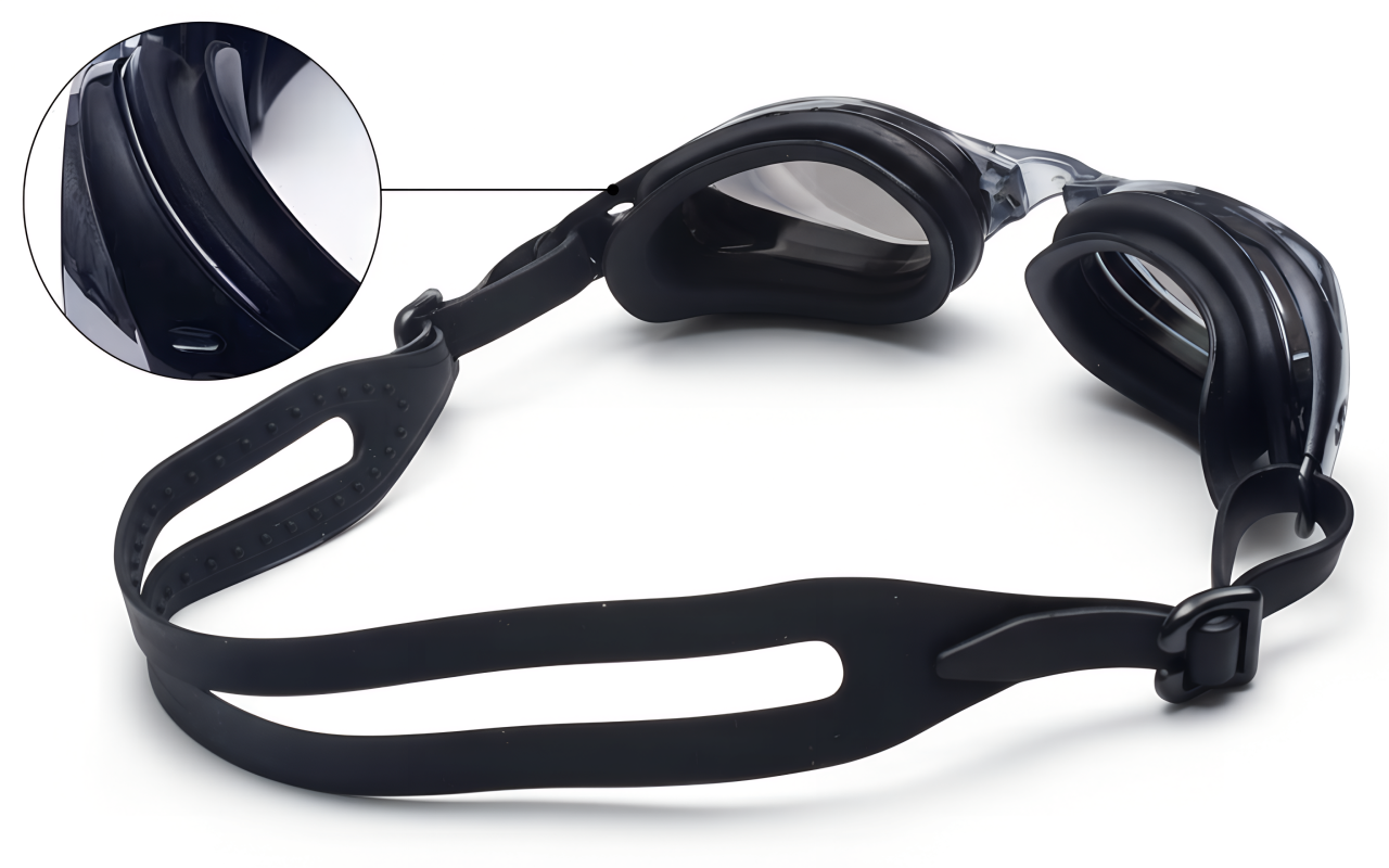 Weiches Silikon sorgt für einen sanften Abschluss und eine einfache Anpassung. Genießen Sie jede Bahn ohne Druck oder Verrutschen um die Augen.