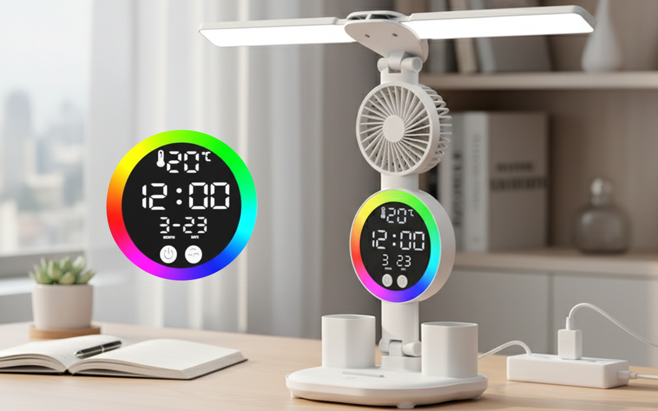 Keine stickigen Schreibtischprobleme mehr. Die Uhr sieht futuristisch aus und die Lampe ist angenehm für meine Augen.