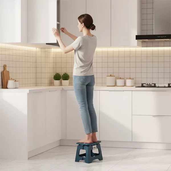 Ich bin nicht groß, also ist dieser klappbare Hocker ein Lebensretter, um Einkäufe wegzuräumen. Er ist leicht, aber richtig stabil.
