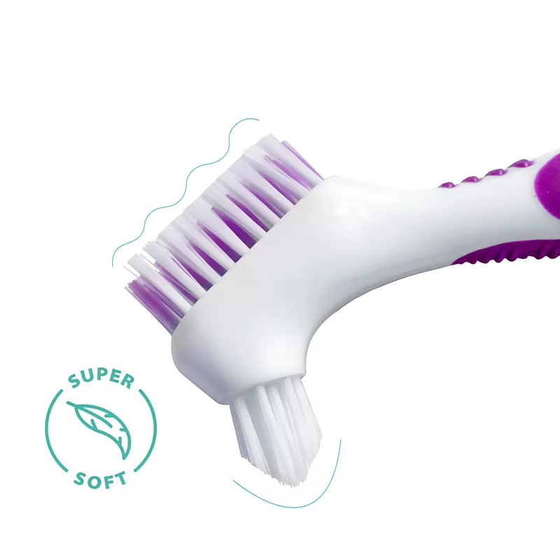 Dieses Werkzeug liegt genau richtig in meiner Hand und macht das Reinigen schnell. Ich mag die doppelseitigen Bürstenköpfe, um überall hinzukommen, und sie ist sanft zu meinen Prothesen.