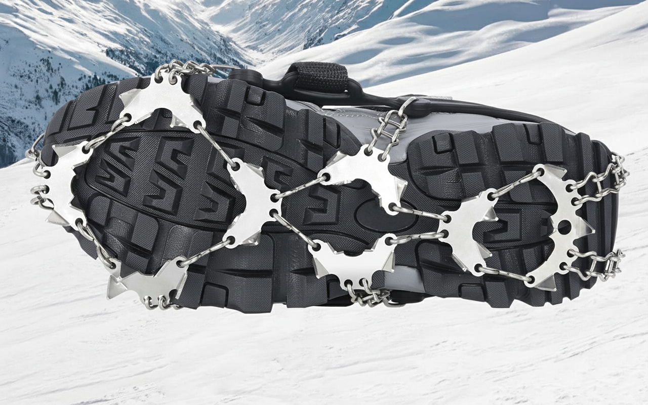 Mehrdirektionale Edelstahlnoppen verankern Ihre Füße auf Eis. Jede Bewegung ist stabil, egal ob Sie draußen laufen oder wandern.