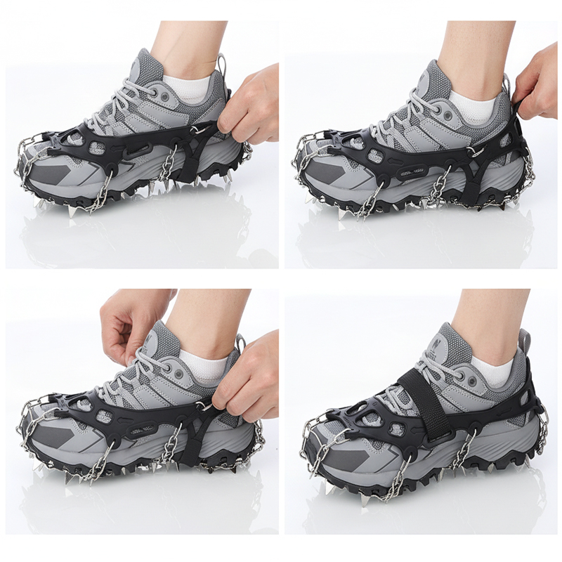 Mehrdirektionale Edelstahlnoppen verankern Ihre Füße auf Eis. Jede Bewegung ist stabil, egal ob Sie draußen laufen oder wandern.