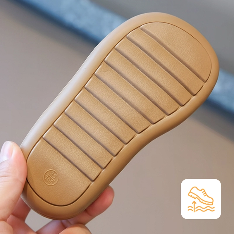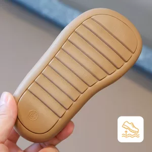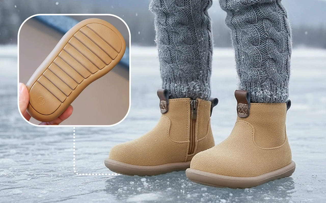 Griffige Sohlen verhindern Ausrutschen auf glatten oder nassen Böden. Kinder stehen sicher auf Spielplätzen, Gehwegen oder Fliesen im Klassenzimmer.