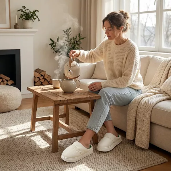 Diese flauschigen Hausschuhe sind so gemütlich und halten meine Füße an kalten Morgen super warm. Kein Druck oder Engegefühl, einfach bei jedem Schritt weicher Komfort.
