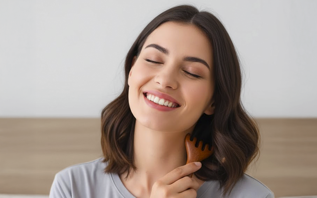 Sanfte, abgerundete Zähne massieren die Haut und lösen Verspannungen. Fühlen Sie sich erfrischt, während die Anspannung mit jedem Strich dahinschmilzt.