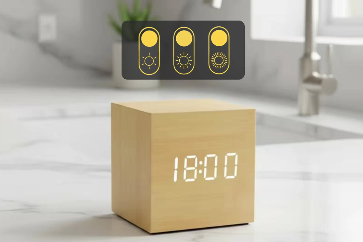 Ich mag das sanfte Display wirklich gern – ich kann die Uhrzeit sogar im Dunkeln ablesen, ohne dass mir die Augen weh tun. Das Holz-Design macht mein Zimmer gemütlich.