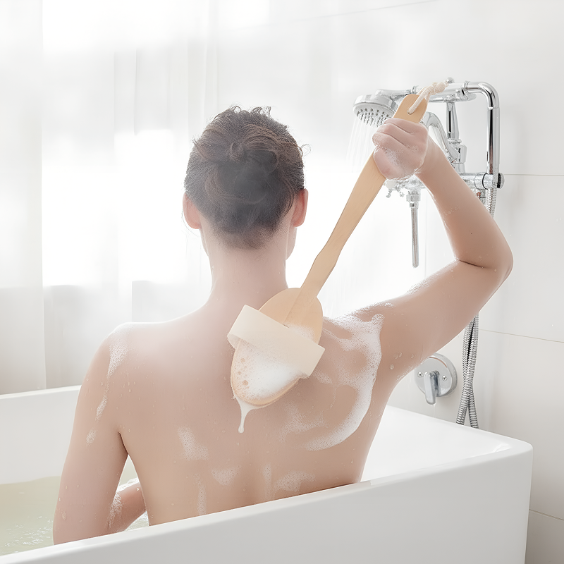 Ich finde es toll, dass ich mich nicht mehr unbequem verdrehen muss. Einfach schrubben und ich bin schneller mit dem Duschen fertig. Das Holz liegt richtig angenehm in der Hand.